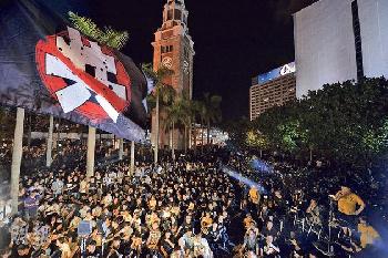 熱血公民發起的六四集會於尖沙嘴鐘樓旁舉行,主打“反共”議題,參加者坐滿廣場,海濱天橋亦站滿人,大會稱有7000人參與,警方指高峰期約有3000人。(圖:香港明報)