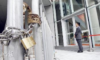 立法會昨加強佈防,門外鐵馬之間加上鐵鏈相連上鎖,令人難以把鐵馬逐個搬走。(圖:香港明報)