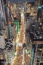 數以十萬計市民昨參加大遊行,明報記者於昨午4時15分從銅鑼灣一大廈(圖),以及晚上7時15分在灣仔一大廈(圖2)向東拍攝,不論日間還是入夜,遊行人龍連綿不斷,擠滿銅鑼灣軒尼詩道3條行車線和2條電車線。(圖:香港明報)
