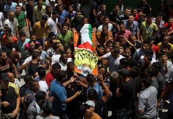 為報復3名猶太青少年遇害,以軍對西岸與加沙展開軍事行動,造成多人傷亡。圖為巴勒斯坦人為一名週二被以軍殺死的青年舉殯。(圖:新華社)