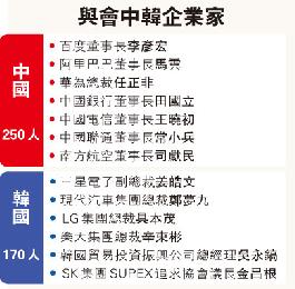 (韓國)在韓國訪問的國家主席習近平今日將在首爾的中韓商務論壇上演講,並參觀臨時的三星和LG展館,單獨會見兩間公司的總裁。多間韓國企業宣佈在華的擴張或合作計劃,而百度董事長李彥宏、阿里巴巴董事長馬雲等中國大企業負責人,亦隨同習近平到訪(見表),與韓國企業家商討合作。