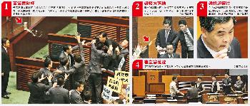 大約10名保安築起人鏈,防止議員走近梁振英,在另一端的黃毓民則站在桌上,不斷向梁的方向擲雜物,包括紙張、書籍,其間擲出一隻盛著水的玻璃杯,跌落在梁的後面,碎片滿地,一地是水。陳偉業和陳志全則向梁擲出紙條摺成的幸運星,以示對財委會主席吳亮星的不滿。