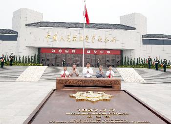 國家主席習近平(中)和抗戰老戰士焦潤坤(右二)、林上元(左二)一起按下啟動按鈕,為“獨立自由勳章”雕塑揭幕。(圖:新華社)