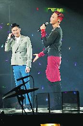 張家輝(左)跟張智霖(右)合唱掀起其中一個高潮。(圖:香港明報)