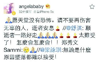 梁詠琪覺得無論是什麼原因都難以接受,很悲痛!舒淇願逝者一路好走:“太難受了!怎麼會怎麼會!”Angelababy:“願天堂沒有恐怖。請不要再傷害無辜的人,逝者安息!”Twins的阿Sa與阿嬌希望遇難者的家屬節哀及堅強,不要再有悲劇發生。G.E.M.感嘆:“當世界如此可笑,生命如此無常,除了感嘆與憤怒,也許我們應該更積極地去分享愛。對大世界感到無能為力的時候,就從小事情手。努力去愛身邊每一個遇到的人,相信愛的力量。”(香港明報)