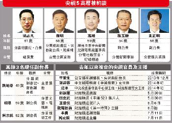 (中國)繼多名部門主管和主播先後遭扣查後,當局對中央電視台的反貪腐調查仍未停止。多個消息來源向本報證實,目前對全台各個頻道都在調查,央視財經頻道幾乎每天都有人被帶走協助調查,未來可能有更高層級官員“落馬”。據知,除台長胡占凡外,央視被有關部門約談的還包括副台長羅明、高峰、孫玉勝和袁正明等人。消息透露,針對央視的調查組已於6月份進駐,廣告財務收支將是調查重點。