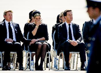 荷蘭國王威廉-亞歷山大(左起)、王后馬克西瑪及首相呂特,昨在空軍基地出席迎接首批馬航空難死難者回國的儀式。(圖:法新社)