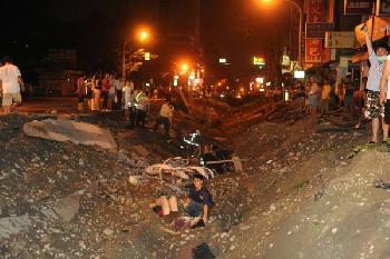 高雄市凱旋三路是重災區之一,警方清晨展開搜救,發現數百公尺長的路段好像被轟炸過一樣,出現深約一層樓的塌陷,至少8架消防車損毀。