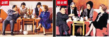 《鄧小平》從1976年講述至1984年,當中涉及鄧小平(左一)與時任英國首相戴卓爾夫人(右一)在北京人民大會堂談判的場面。左圖為劇照,右圖為當年實况圖片。(網上圖片)
