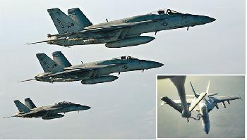 美國空軍中央司令部發放照片,顯示美國海軍的“F-18E超級大黃蜂”戰機週二在伊拉克北部地區空中加油(小圖),之後列隊飛行(上圖)。美軍當天聯同阿拉伯5國空軍空襲伊拉克和敘利亞的ISIS據點。(圖:法新社)