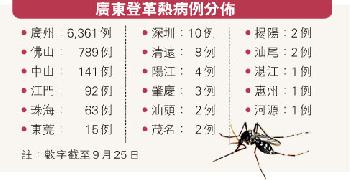 廣東省衛生計生委昨日通報全省登革熱疫情,截至9月25日零時,全省登革熱確診病例已達8273例,累計病例數較去年同期上升1341.29%。其中絕大部份是本地病例,境外感染輸入病例僅32宗。