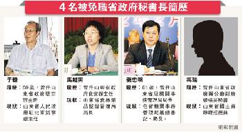 據瞭解,上述四人週五被免去副秘書長前,均身兼數職。於毅自2006年2月起一直擔任山東省駐京辦主任至今,2008年3月起同時擔任省政府副秘書長。馬越男擔任省政府副秘書長多年,2013年任改名成立的山東省食藥監局局長,兼該省食品安全委員會辦公室主任。馮瑞曾任省政府辦公廳副主任,2013年4月任省政府副秘書長。被免職當天,馮瑞被任命為山東省國土資源廳巡視員。張忠明則於2012年9月21日兼任山東省省級機關事務管理局黨組書記、局長。