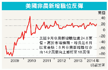 9月非農職位經季節性調整增加24.8萬個,遠高於市場預期的21.5萬個,增長是6月以來最快。8月原本出乎預期低的14.2萬個新增職位,亦大幅上調至18萬個。