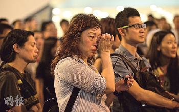 學聯秘書長周永康與其他執委回應政府擱置對話的決定後走進示威群眾交代。其間週一度哽咽,有示威者被觸動落淚。(圖:香港明報)