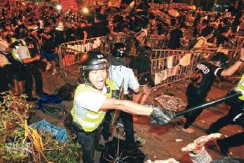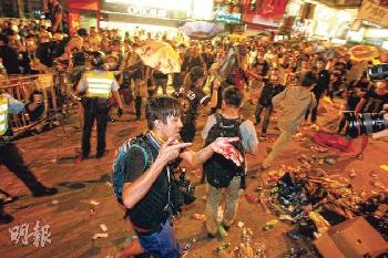 (香港)旺角佔領區今日(19日 )凌晨再次爆發衝突,示威者由彌敦道亞皆老街路的防線,向屬前佔領區主帳位置的亞皆老街與彌敦道十字路口進逼;部份示威者站在鐵馬後,高呼要求警方開路以圖再次佔領。大批手持防暴裝備的警員立即增援,並多次舉起紅旗。警員向雨傘陣揮動警棍,示威者則躲在雨傘後,衝突中有示威者被打傷頭部,學民思潮成員凱撒被打中頭部流血,事件中多人被捕。