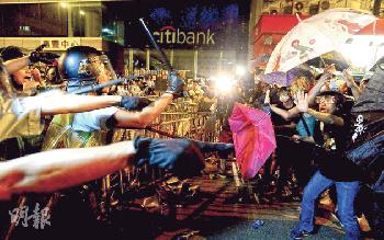 衝突中警員不斷揮舞警棍,促示威者不要再衝突。(圖:香港明報)