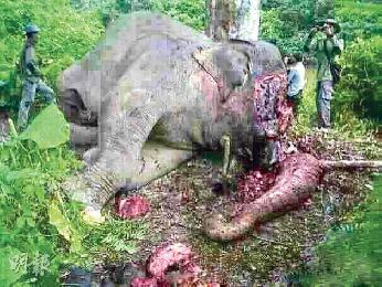 昨日央視新聞中心官方微博上載野生亞洲象被殘忍殺害的現場照片,可見大象的半個頭被砍下,血流遍地,大象的鼻子被扔在一邊,象牙則不知所終。
