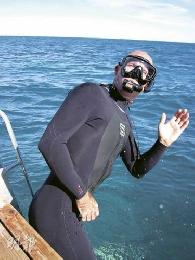 我們六個人站在船尾,把潛泳鏡戴好,準備就緒,導遊一聲高呼:“Go!”我們迅速滑入海裡,當我還在適應海水浮力,剛把身體浮好,抬頭一看,一個巨大的灰影橫在眼前,那是甚麼?大腦剎那間來不及反應,那還有甚麼?不就是這趟西澳旅遊的目的──鯨鯊。