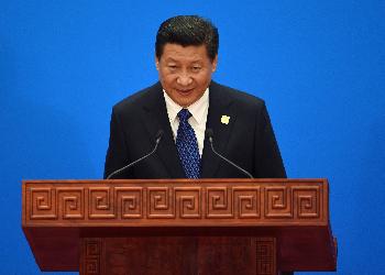 習近平在閉幕式的記者會上,對記者宣佈將實現APEC互聯互通藍圖。(圖:法新社)