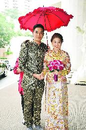 駛進陽明山莊後,黎諾懿先落車為老婆開門,大妗姐上前撐起紅傘。問早上接新娘是否很開心?他說:“是呀,多謝大家。”新娘子身穿金色的紅底旗袍和繡花鞋,頸部戴金豬牌,雙手戴滿金手鐲,左手的鑽石戒指十分耀眼。他們大方讓記者拍照。