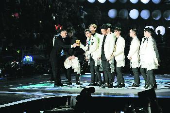 EXO成員上台領獎,更逐一跟華仔鞠躬握手。(電視圖片)