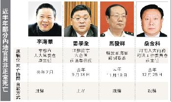 (中國)今年元旦過後,全國多省區的黨政機關、高校以及企業事業單位,都收到中組部關於“18大以來黨員幹部非正常死亡情况統計表”。專家指出,18大後中央加大反腐力度,官員自殺數字飈升。統計將有利中央更好掌握反腐動態,為推進反腐提供依據。