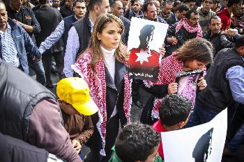 約旦王后拉尼婭(中)上週五(6日)手持被ISIS燒死的空軍機師卡薩斯巴的肖像海報,在首都安曼參與遊行,海報上面寫著“卡氏是正義烈士”的字句。(圖:法新社)