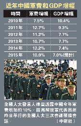 據瞭解,2014年,中國軍費的增幅是12.2%,為8082億元(人民幣,下同)。2015年,如按10%的增幅計,約為9000億元,繼續穩居世界第二。去年,中國GDP增長率為7.4%,是自1990年以來新低。