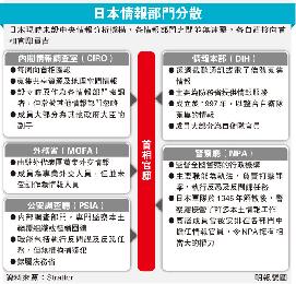 現時日本並無中央情報機構,而是分別由5個互相獨立的部門負責蒐集不同範疇的情報,例如蒐集外交情報的外務省,截取通訊情報的防務省情報本部等,各部門均直接向首相匯報(詳見圖)。惟在年初發生的極端組織“伊斯蘭國”(ISIS)斬殺日本人質事件,惹來輿論質疑日本缺乏自身情報網絡,過度依賴盟國協助而錯失救人時機。