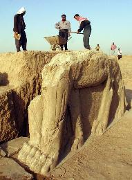 尼姆魯德是亞述王朝歷史名城,曾為政治和文化中心,輝煌一時。圖為2001年7月,考古人員在當地清理一尊出土的殘缺“人面翼牛”雕像。(圖:法新社)