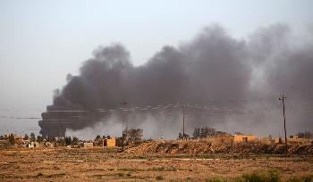 ISIS為阻聯軍進逼,放火燃燒當地可日產2.5萬桶原油、1.5億立方呎天然氣的阿吉勒(Ajil)油田。週三(4日)下午起,油田內冒起黑色濃煙。一名軍方消息人士向路透社稱,ISIS企圖用黑煙阻撓伊軍直升機施襲。聯合國稱,提克里特2.8萬名平民逃難避禍。