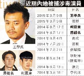 (中國)內地演員王學兵和張博因涉嫌吸毒被北京警方拘捕。據圈中人透露,王學兵吸毒超過15年,多年前他為拍攝某部作品急速減肥,從而沾染上毒品。還有知情者稱,王與前妻孫寧離婚的主要原因就是因為吸毒。曾是TVB前娛樂主播的王學兵妻子張璇對今次事件回應稱:“怎麼可能啊,這太奇怪了,我沒什麼好回答的。”。