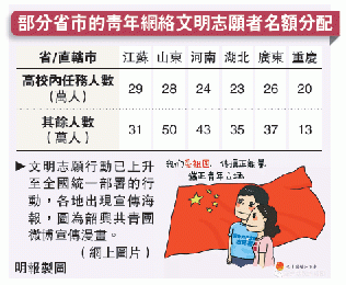 根據團中央在今年2月13日下發的一份文件顯示,全國各省市區都需按配額提交志願者人數。本報在江西、廣東、湖北等省份的共青團或高校官網中,都找到了包含同樣信息的文件。這份標註為〈共青團中央文件〉(圖)的通知指出,在全國團員範圍內組建青年網絡文明志願者,各省、市、縣的志願者人數不少於共青團員總數20%。