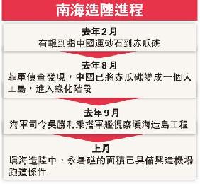 (中國)繼永暑礁填成南沙第一大島後,中國在距離菲律賓巴拉望島(Palawan)西北邊約135公里的美濟礁大面積填海造陸,中美雙方就此議題展開唇鎗舌劍的交鋒。外交部發言人前日回應相關提問時稱,中方在自己的領土填海造陸是民用規劃,合理、合情、合法,並暗諷美國說三道四,雙重標準。美國總統奧巴馬(Barack Obama)昨日罕有地批評中國在南海主權爭議問題上“以大欺小”,並表達對中方不守國際規範和準則的憂慮。中方不依不撓,昨天反駁時暗指美國才是世界上最大的“塊頭和肌肉”。