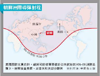 朝鮮核武威脅增加或會促使美國採取部署導彈防禦系統等反制措施。美國北方司令部司令戈特尼(William Gortney)本月表示,國防官員相信朝鮮已有能力把核彈頭裝載到“KN-08”洲際彈道導彈上。美國官員認為,朝鮮仍未試射過這種導彈,專家估計其射程達9000公里,覆蓋中國、俄羅斯全境、歐洲大部份地區及美國加州等西部州份(圖)。