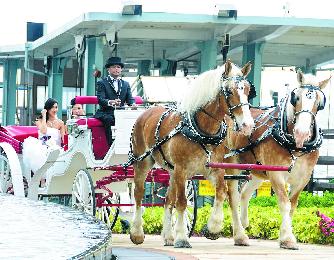 汪明荃與“新娘”鍾嘉欣坐馬車到達禮堂。(圖:香港明報)