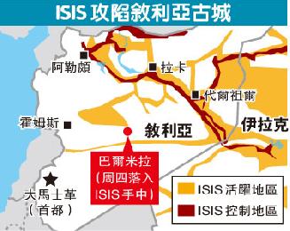 總部位於英國的“敘利亞人權觀察”昨稱,ISIS徹夜猛攻巴爾米拉,逾100名親政府部隊人員死亡,政府軍撤離該城和周邊據點,市中心的空軍基地、監獄及情報總部已完全由ISIS控制。當局之前已疏散城內居民。敘利亞人權觀察稱,ISIS攻陷巴爾米拉後,已佔領了敘利亞一半領土。