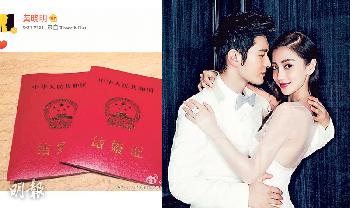 昨日黃曉明報喜訊,下午5時許,他在微博上載兩本結婚證的照片,附上一個心形圖案。Baby轉發了曉明的微博,自己又加上一個心形圖案,兩人心心相印報喜。Baby的經理人Kim回應記者說:“已經領證,感謝大家的祝福。”