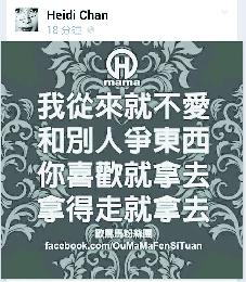 陳慧玲昨午在fb轉貼一張24字真言的圖,似回敬Mandy:“拿得走就拿去。”(網上圖片)