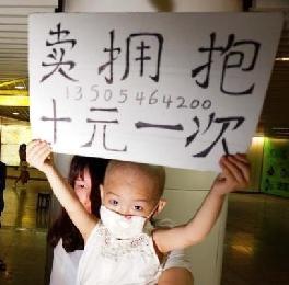 (中國‧重慶)近日在中國重慶兩路口輕軌站,28歲媽媽陳得娟以賣擁抱方式,為白血病女兒籌醫療費。她舉起牌子,上面寫著“賣擁抱,十元(人民幣‧下同,約6.15令吉))一次”。坐在她身邊的,是幾乎光頭、戴著口罩的女兒娜娜。