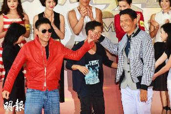 學友爆王晶已多次改劇本,他跟華仔本來沒有對手戲,現在加了一場。問他們會否合唱電影主題曲?華仔說能合唱就最好,學友提議加發哥Rap而嘉玲也合唱。華仔和學友繼《旺角卡門》再合作,華仔透露本來想重拍《旺》片,但找不到投資者,和不知向誰購版權。今次再演刀仔一角,雖然已以舊look示人,但感覺仍很新鮮。學友就表示估不到和發哥做情敵爭嘉玲,很久以前自己只是做發哥細佬!