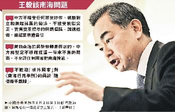 王毅還不點名警告美國,稱不歡迎“域外國家”對《南海行為準則》的商談“隨便指手劃腳”。他說,當前南海的局勢總體是穩定的,不允許任何國家把南海搞亂。