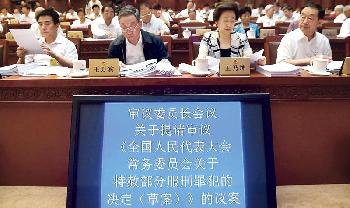 新華社報導,全國人大常委會昨日審議了關於特赦部份服刑罪犯的決定草案。草案規定,為紀念中國人民抗日戰爭暨世界反法西斯戰爭勝利70週年,特赦2015年1月1日前正在服刑、釋放後不具有現實社會危險性的四類罪犯。李適時說,從實際效果看,此舉可以激發人民群衆的愛國熱情,發揮特赦的感召效應,促進社會和諧穩定。