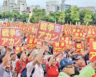 日本參議院正審議解禁集體自衛權的安保法案,批評者一直指此法案違反和平憲法第9條,反安保運動近月日趨熾熱。由多個民間組織組成的“反對戰爭,不許破壞第9條!總動員行動實行委員會”昨發起“國會10萬人、全國100萬人大行動”,要求首相安倍晉三擱置安保法案及下台。主辦單位稱東京有12萬人參加包圍國會行動,警方稱只有3萬人。