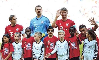 • 德甲球會拜仁慕尼黑球員在上週六主場聯賽出場時,分別拖著一名德裔和一名難民孩童,象徵社會融合,贏得球迷喝彩和掌聲。(圖:法新社)