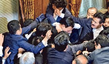 參議院特別委員會前晚原訂召開審理安保法案的總質詢,但在反對黨杯葛下無法召開。特別委員會委員長鴻池祥肇昨晨運用職權召開會議,在野黨向鴻池提出不信任動議,中午遭否決。執政自民黨議員提出動議停止總質詢,決議獲通過。在野黨議員強烈抗議,衝上前包圍鴻池,試圖搶咪,自民黨議員擁上前救駕,兩派議員扭成一團,混亂中有人臉部遭拳擊中。法案在這時候表決,獲自民黨與執政聯盟公明黨等5黨贊成通過。事後在野黨斥責特別委員會取消總質詢、強行闖關的做法違反程序,鴻池辯稱法案已獲充份審理,不能一直討論下去。