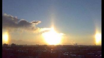 奇景,遠望3道太陽從地平線散出的光線,在空中相連成一個半圓,罕見的現象讓人驚呼好美,但也有人將此視為不祥的預兆,或是預告嚴冬即將到來。專家解釋,這是一種稱為“日狗”或“幻日”的日暈效應,當陽光穿過懸浮在空中的冰晶反射後所形成,通常在夜間霜降、溫度急速下降時發生讓人產生錯覺。而晚上也可能會出現“3個月亮”,稱之為幻月。據報導,幻日現象從烏拉山脈到俄羅斯遠東地區都可看到,許多民眾都被這種視覺錯亂和光度嚇到,引發多起交通事故。(馬來西亞星洲日報)