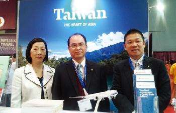 中華航空紐約分公司總經理丘偉端(中)率領同仁出席紐約時報旅展開幕式時表示,華航將在今年五月中旬增加紐約台北航班每週四天,六月起每週五天。(圖:羊展恬)