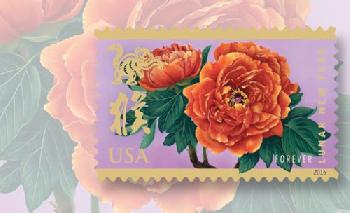 據瞭解,今年的猴年郵票,以淡紫色為背景,主圖為兩朵怒放的牡丹花,這是繼2010年虎年郵票的水仙花之後,美國第二輪生肖郵票中又一套以花卉為主題的郵票。