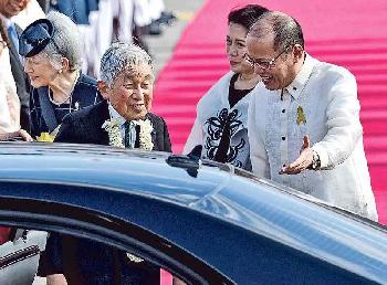 (日本)日本天皇明仁昨日攜皇后美智子展開訪問菲律賓之行,慶祝日菲建交60週年。明仁54年前曾以太子身份訪菲,今次則成為歷來首名訪菲的日本天皇,日本傳媒報導,5日4夜訪問旨在拓展雙邊關係,並在明仁強烈要求下加入祭奠兩國二戰死者行程,藉祈願和平。